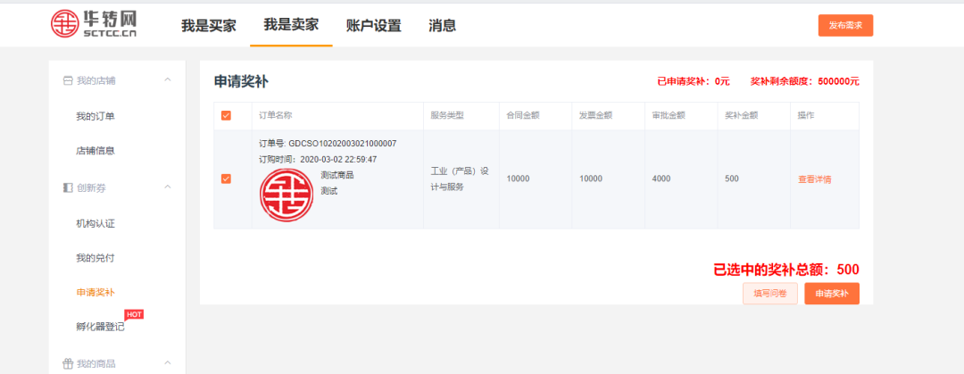 服務機構登錄后,可在【用戶中心】--【我是賣家】---【申請獎補】對已兌付的訂單申請獎補。