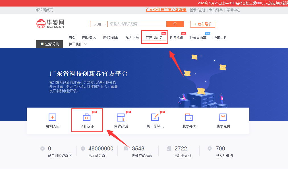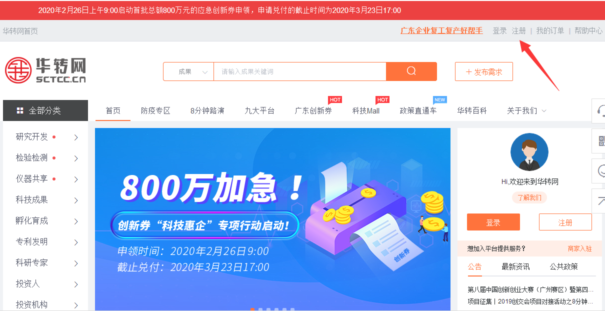 打開廣東省創(chuàng)新券工作實(shí)施的官方平臺(tái)——華轉(zhuǎn)網(wǎng)(http://www.sctcc.cn),并完成注冊(cè)步驟。