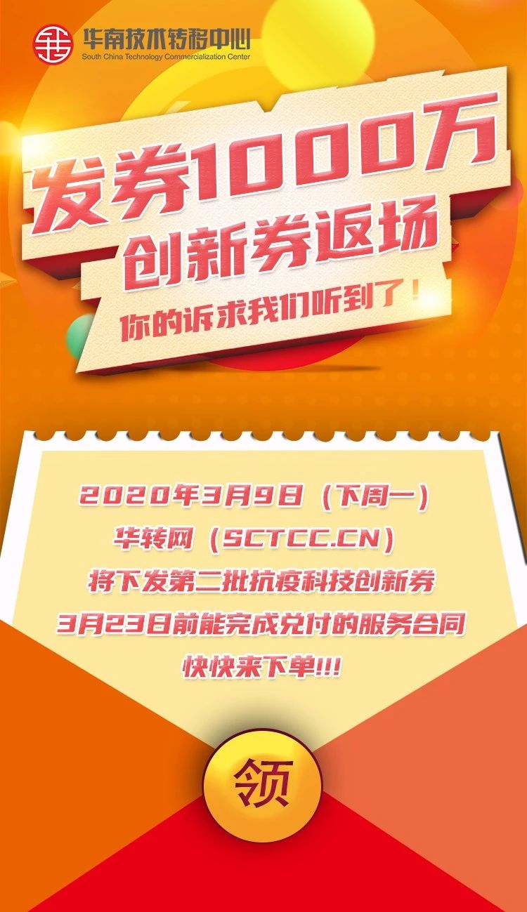 終于,新一批創(chuàng)新券1000萬(wàn)元額度確定!將于3月9日(周一)9:00準(zhǔn)時(shí)發(fā)放。執(zhí)行標(biāo)準(zhǔn)參照抗疫創(chuàng)新券,珠三角40%,粵東西北45%。(溫馨提醒:兌付截止時(shí)間為3月23日,如果在規(guī)定時(shí)間前無(wú)法完成兌付服務(wù),建議等待申請(qǐng)2020年度創(chuàng)新券使用。)